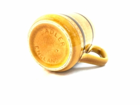 Gulbrúnn kaffibolli, eða fantur með 2 dökkbrúnum röndum og ljósu munstri í kringum renndurnar. Undir bollanum stendur ADLER ENGLAND.