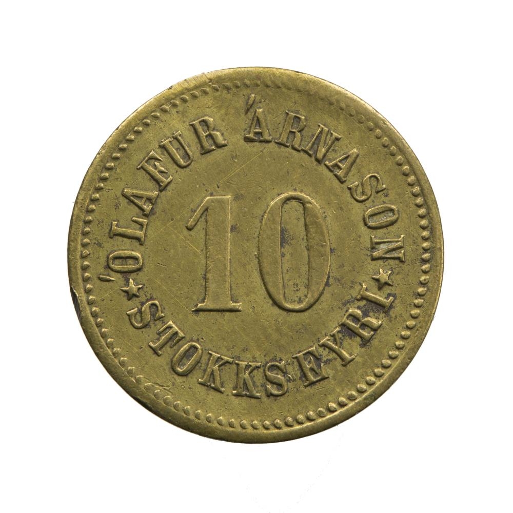 Þessi 10 aura vörupeningur var framleiddur fyrir verslun Ólafs Árnasonar á Stokkseyri. Peningurinn var gjaldgengur í verslun Ólafs frá því um 1900 til ársins 1902. Líkur benda til þess að peningarnir hafi verið sleginn af L. Chr. Lauer í Þýskalandi með milligöngu N. Hansen & Co í Danmörku.