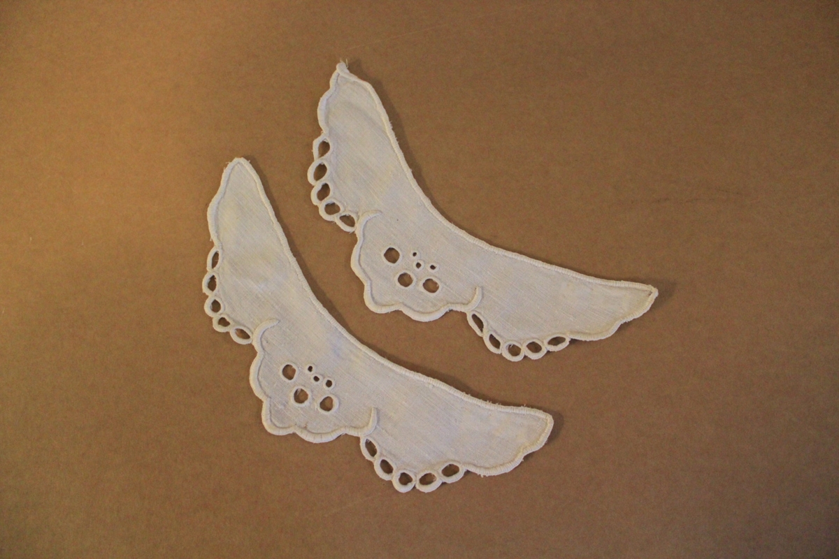 Tvö uppslög með húll- og kapmellusaum. Ásgerður var fóstra gefanda. Hún saumaði uppslögin að öllum líkindum á son sinn Kára Sigfússon sem fæddur var 1927 og dáinn 1930. Til er mynd í fórum gefanda þar sem Kári er með kraga og uppslög. Þessum safngrip er tilheyrandi gripir númer 1465 b,