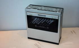 Videokassettutæki (upptökutæki) W.H.S. National. Í svartri leðurtösku notað með Canon vélinni nr. 1996/48. Gefandi Sigurður R Guðmundsson.