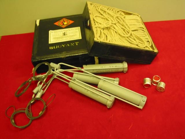 Grænn trékassi með handfangi og í honum er línubyssa í járnkass af Akranesferju II. og snæri.