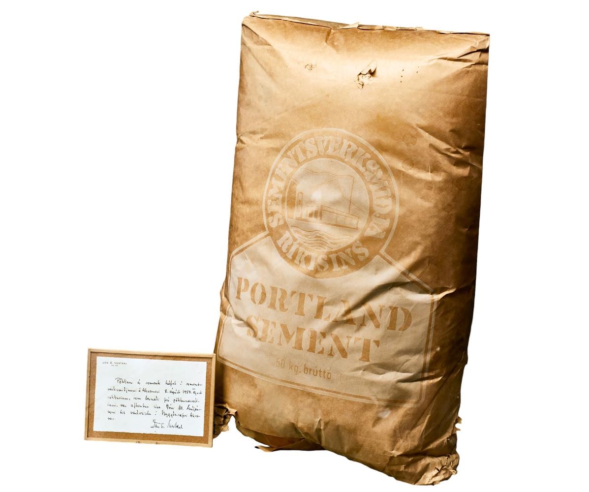 Fyrsti íslenski sementspokinn er framleiddur var í Sementsverksmiðju Ríkisins á Akranesi.Pokinn var gefinn af verksmiðjunni ásamt glerkassa þeim er hann er geymdur í.