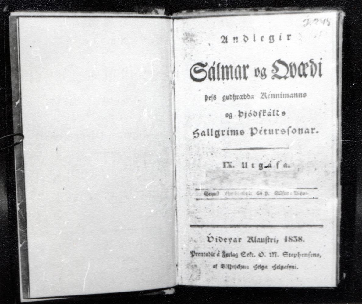 IX útgáfa, 276 blaðsíður. Titilblað er ljósprentað. Bókin er í gömlu skinnbandi. Prentað í Viðeyjar Klaustri 1838. Þar var prentsmiðja 1819-1844 sem Magnús Stephensen.