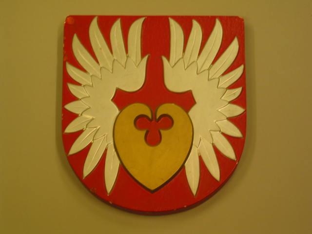 með upphleyptu merki á framhlið, grátt og gulleitt á lit. Trúlega félagsskjöldur