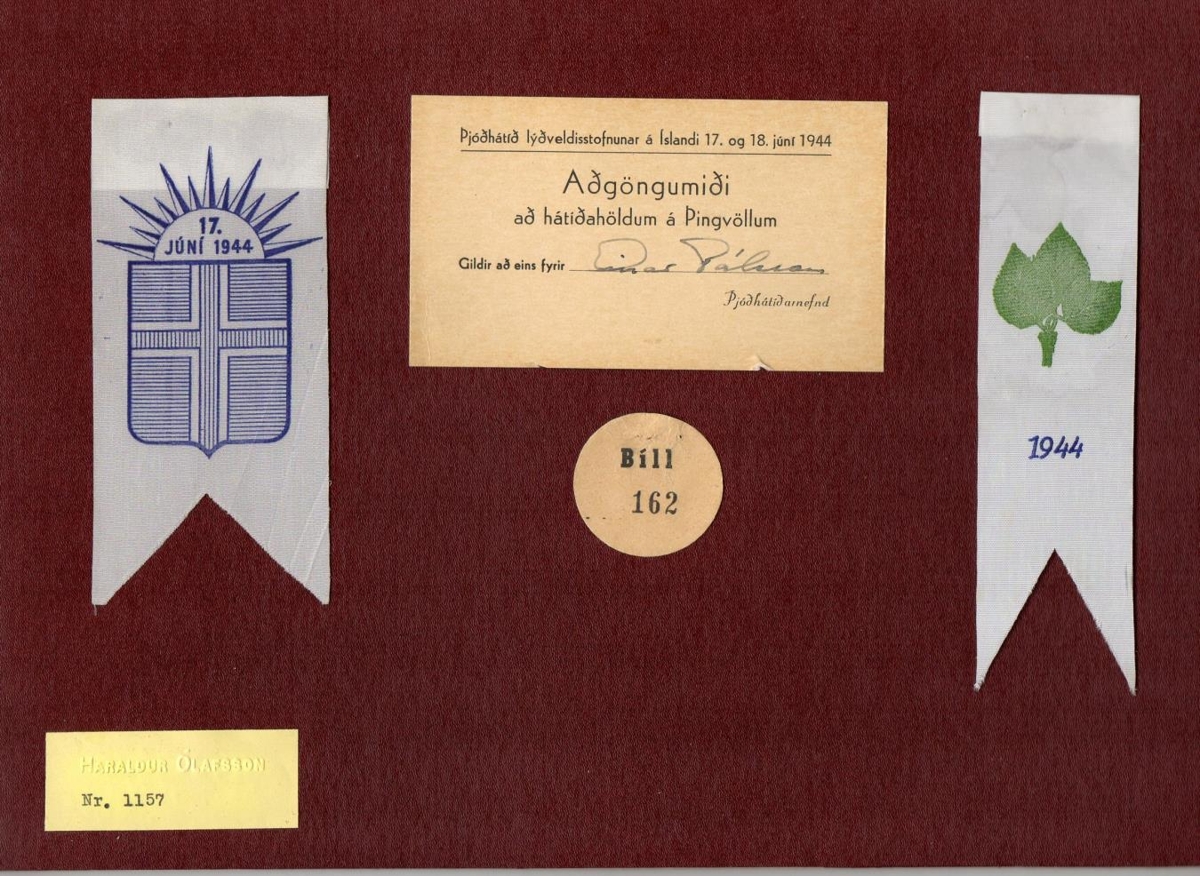 Aðgöngumiði og merki frá hátíðahöldunum á Þingvöllum 17 og 18 júní 1944.