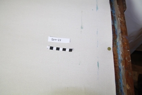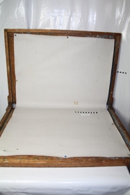 Trönur, en fæturnar vantar. Inn í trönunum er strigi festur með teiknibólum. Málning hefur slest á hann og líklega kaffi líka.