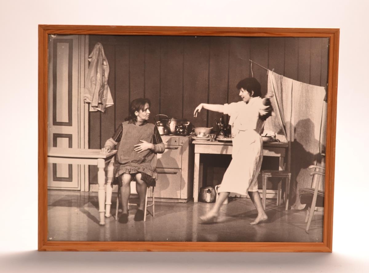 Svart/hvít ljósmynd í viðarramma af tveim konum á leiksviði