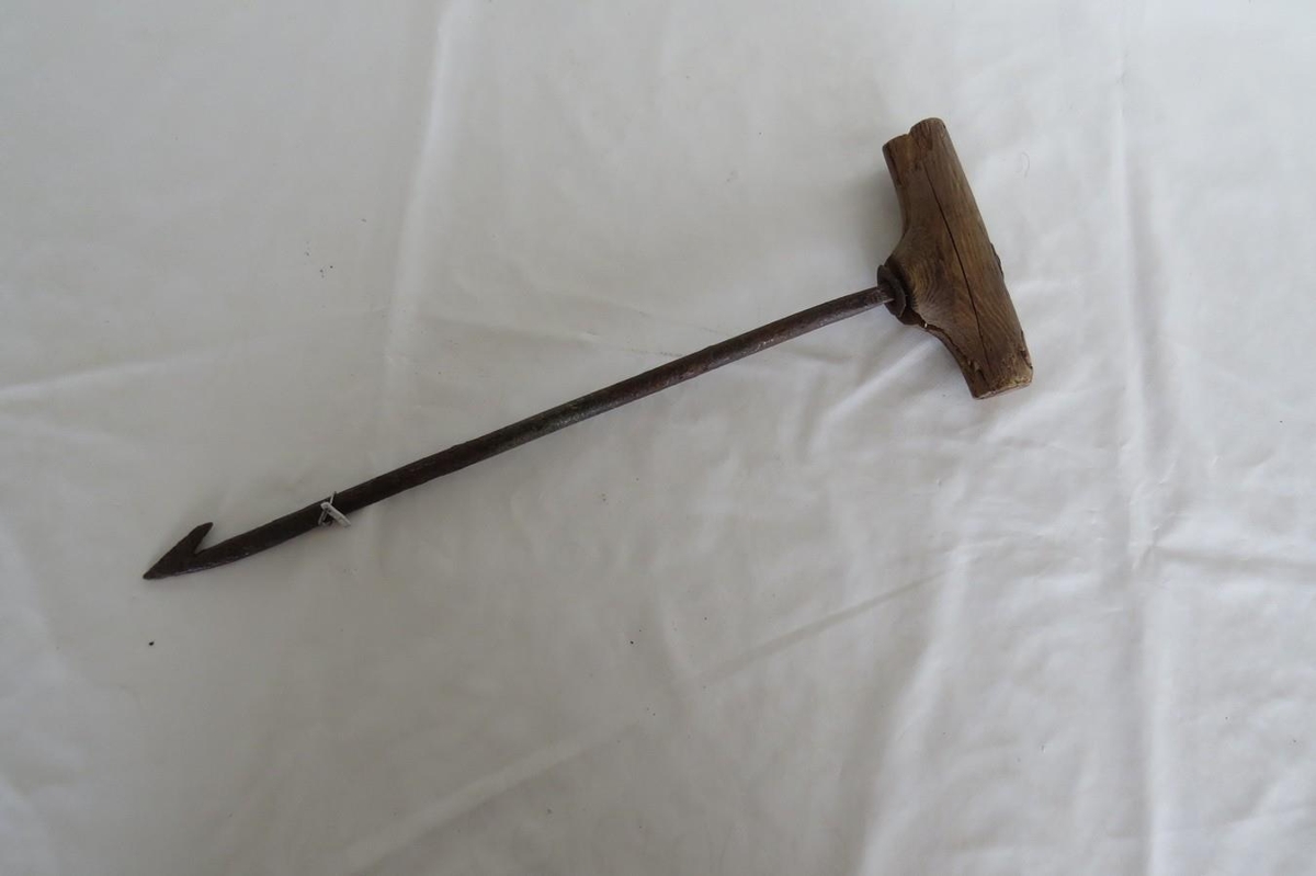Heynál með tréskafti. Hún var smíðuð af Þórði Bjarnasyni á Ljúfustöðum í Kollafirði en endaði á Miðhúsum og var gefin safninu af Guðfinni Finnbogasyni.