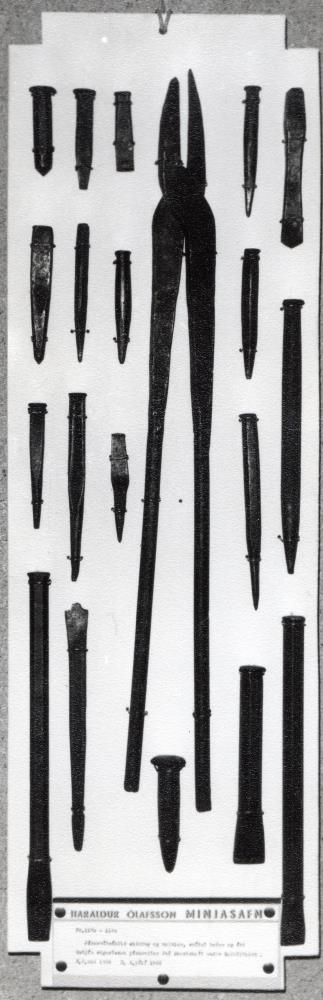 Járnsmíðaáhöld; eldtöng og meitlar, smíðað hefur og átt Guðjón Sigurðsson járnsmiður frá Skarðshlíð undir Eyjafjöllum. Sonardóttir hans, Sigrún, gaf Haraldi 20.10.1977