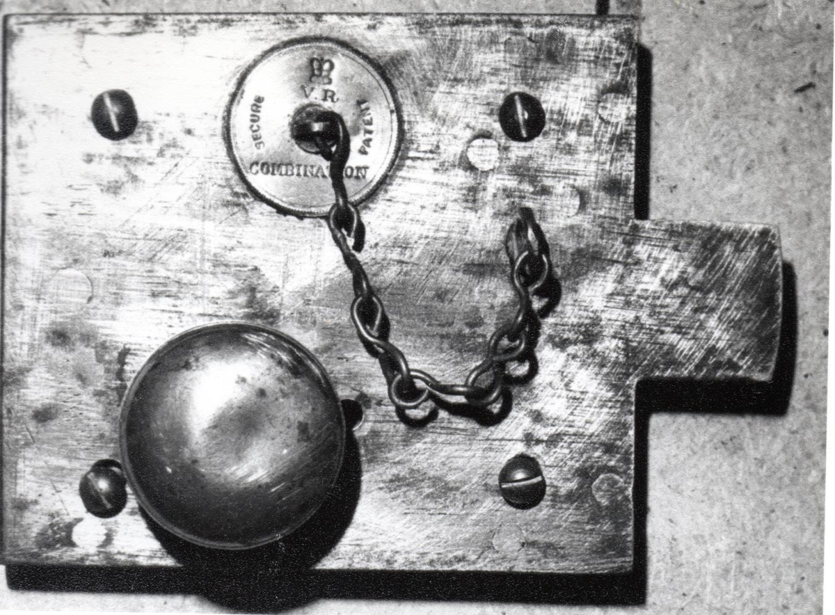 Læsing úr járni með koparhnúð. Átt hefur Guðjón Sigurðsson Járnsmiðjur frá Skarðshlíð undir Eyjafjöllum.