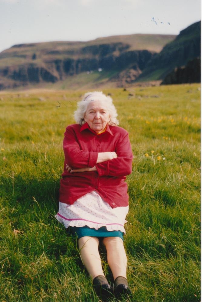 Margrét Oddsdóttir (1906-2008) á Jörfa situr í gamla kirkjugarðinum á staðnum.
