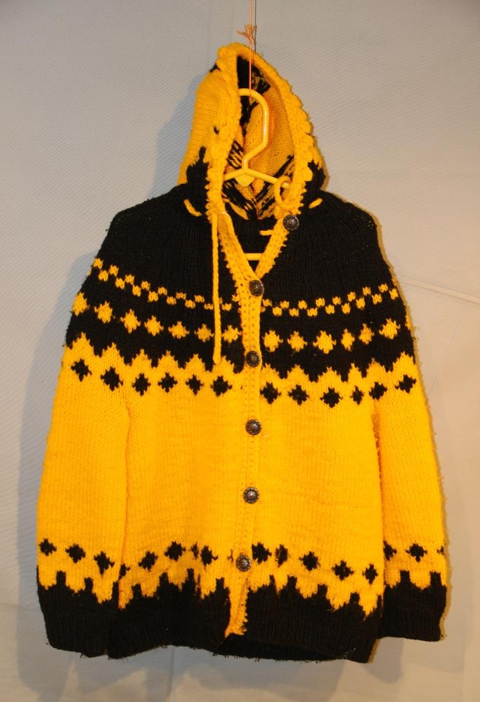 Flíkin er hettupeysa, hneppt - gul og svört. Lopin sem peysan er prjónuð úr er framleiddur á Gefjun á Akureyri. Stærð: Medium.