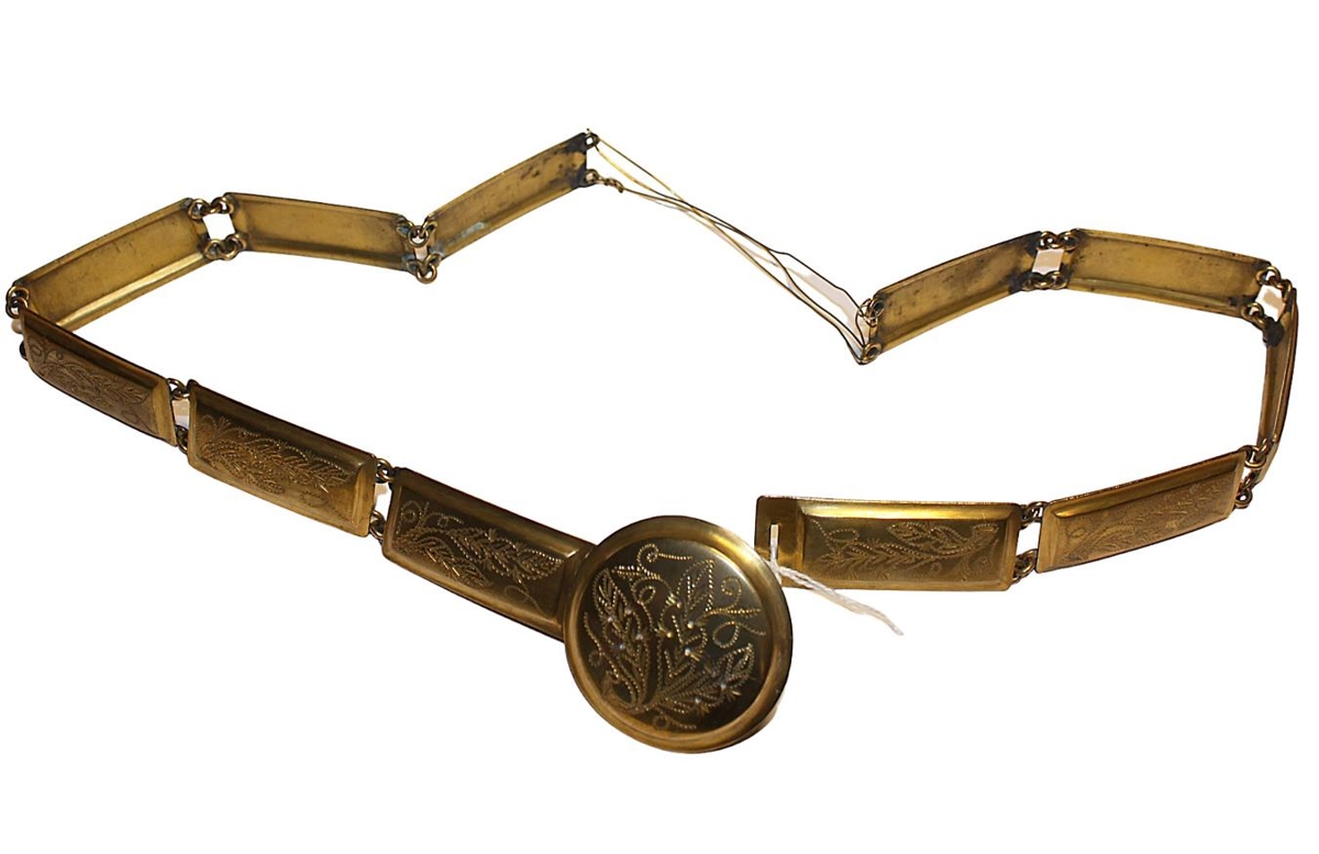 Beltið er af skrautbúningi Þórunnar Sívertsen húsfreyju í Höfn í Melasveit. Sonur hennar, Pétur Sívertsen bóndi í Höfn í Melasveit gaf safninu beltið.