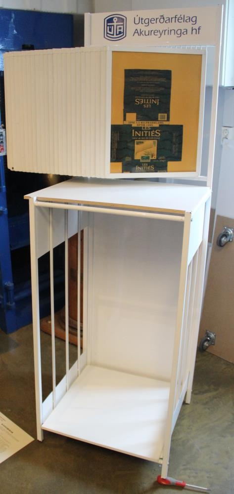Skápurinn er hvítur að lit. Hann er fyrir 24 flettiramma sem geyma 48 pakkningar fiskjar er unninn hefur verið til útflutnings hjá Ú.A. á Akureyri. Skápurinn er í reynd kynningartæki fyrir umbúðir Útgerðarfélags Akureyringa. (S.H. = Sölumiðstöð Hraðfrystihúsanna).