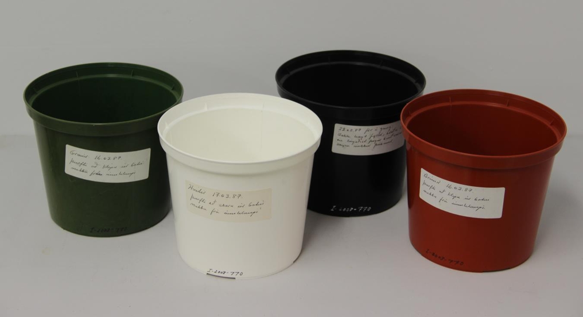 Fjórir blómapottar, svartur, grænn, brúnn og hvítur. Áletrun á botni: BS plast - Akureyri Iceland. 2. OL G 15 - 569 0613 44415. Sjá upplýsingar á I-2003-769