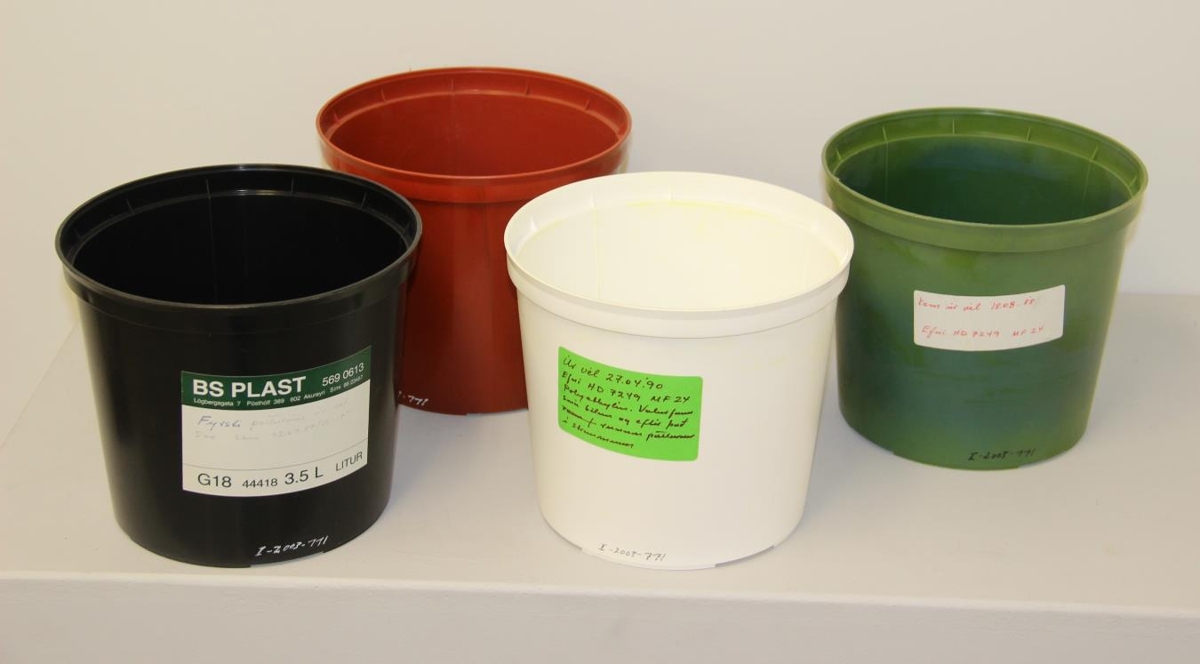 Fjórir blómapottar, svartur, grænn, brúnn og hvítur. Áletrun á botni: BS plast - Akureyri Iceland. 3,5 L G 18 569061344418. Sjá upplýsingar á I-2003-769.