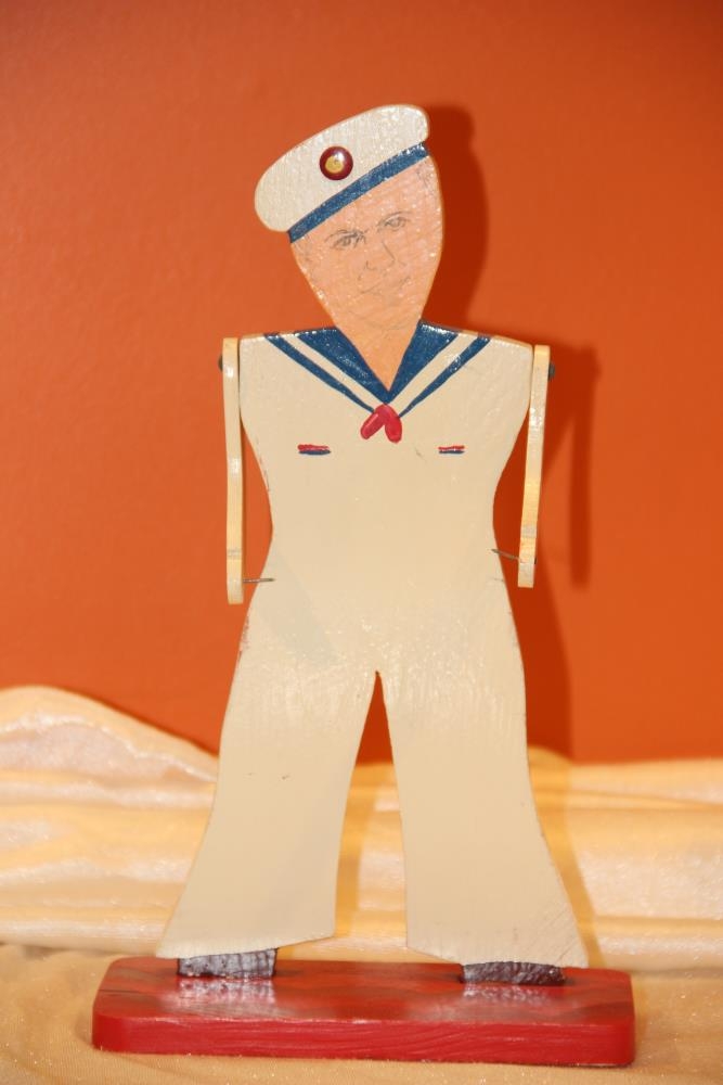 Sjóliði á palli. Útsagað mót af sjóliða í matrósafötum, festum á rauðan pall. Af ífestum nöglum í höndum sjóliðans má ráða að eitthvað vanti. Það kemur í ljós á myndum af framleiðsluvörum Leikfangagerðarinnar, að það sem vantar er harmónika, en sjóliðinn er nr. 153 á myndaseríunum sbr. I-2003- 1116.
