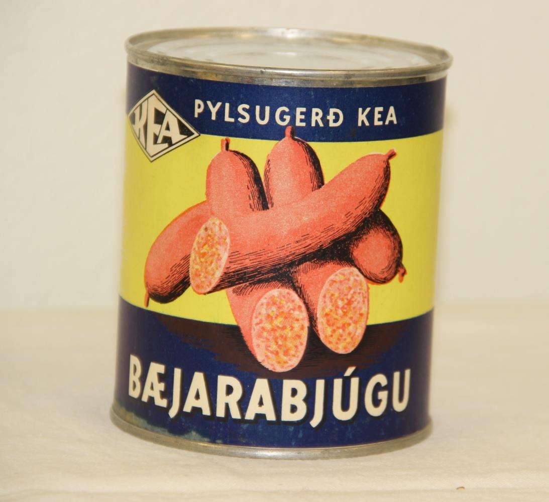 Dósin er silfurlit (galvaniserað blikk). Áletrun á álímdum miða í mörgum litum: KEA-tígullinn. Pylsugerð KEA - Bæjarbjúgu - Teikning af bjúgum/pylsum sem eru rauðbleikar að lit. Þessi vara mun vera frá upphafsárum niðursuðu hjá Pylsugerð KEA í Grófargili sbr. I-2002-584 og I-2003-1156.