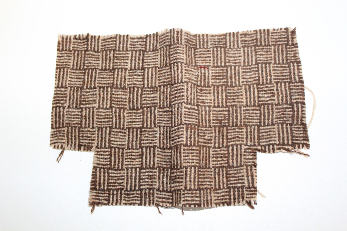 Sýnishorn af ofnum fatadúk í sauðalitum. Tætt af Ingibjörgu Þórðardóttur Hofi, Svarfaðardal og ofið af Soffíu dóttur hennar.