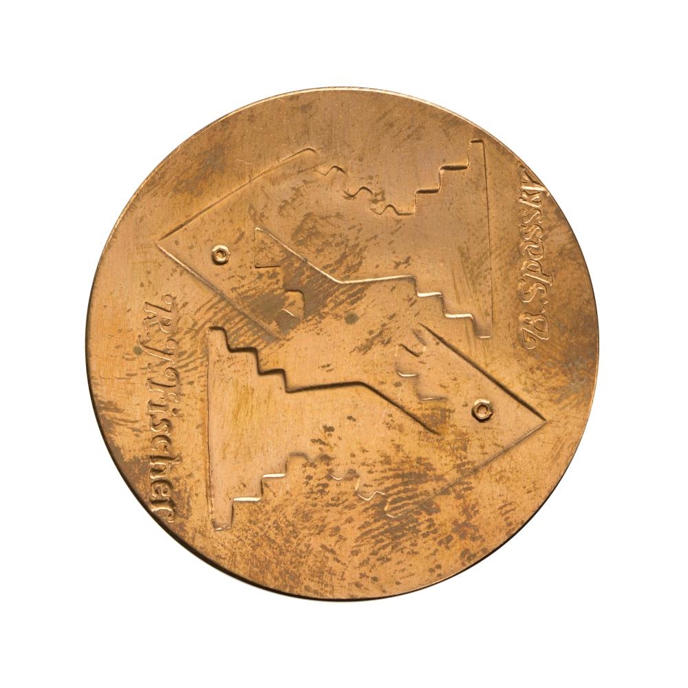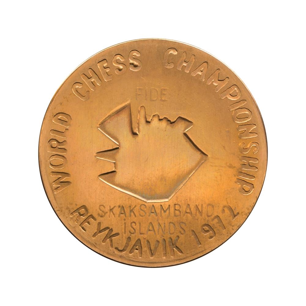 Þessi minnispeningur var búinn til af Skáksambandi Íslands fyrir Heimsmeistarakeppnina í skák sem halding var á Íslandi árið 1972. Þessi peningur tilheyrir fyrstu útgáfu af þeim peningum sem Skáksambandið bjó til fyrir keppnina.