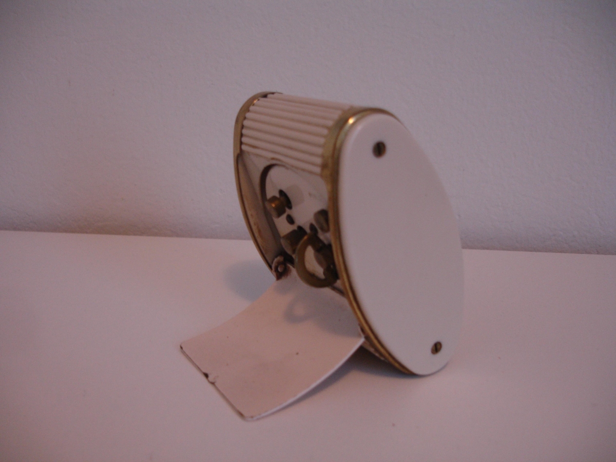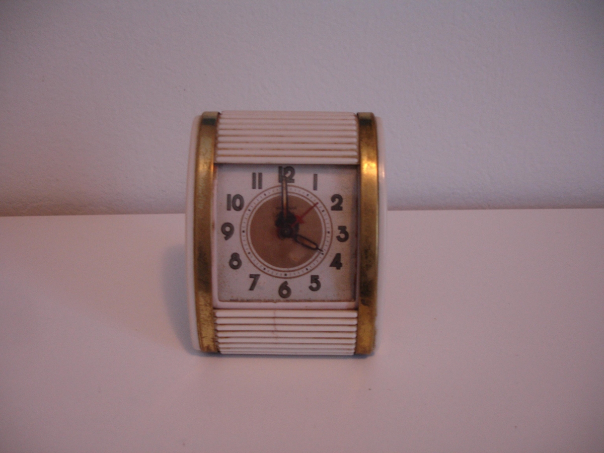 Vekjaraklukka úr eigu Tryggva Jóhannssonar bónda á Ytra-Hvarfi. Hún er gjöf frá Zophoníasi Þorkelssyni, iðjuhöld í Winnipeg, Kanada. Klukkan er hvít með gylltum gjörðum. Hún er sívöl/sporöskjulaga. Á bakhliðinni er hægt að opna málm"lok" sem nýtist þá sem standur fyrir klukkuna en lokar annars fyrir stillitakka klukkunnar. Framan og neðan á klukkunni er renniloka úr plasti sem hægt er að renna fyrir klukkuskífuna eða draga niður svo sjáist á klukkuna.