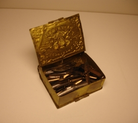 Pennaoddarnir í öskjunni eru merktir mismunandi framleiðendum. 25 oddar eru merktir D. Leonardt og gætu hafa fylgt öskjunni upprunalega en að auki eru 13 oddar merktir Perry & CO London, 7 oddar merktir Herm.Muller Leipzig, 2 oddar merktir Brause&Co´s Iserlohn, 1 oddur merktur Mitchell´s England (merking ekki vel greinileg) og 3 oddar að auki þar sem merking er illlæsileg eða jafnvel engin. Alls 51 pennaoddur.
