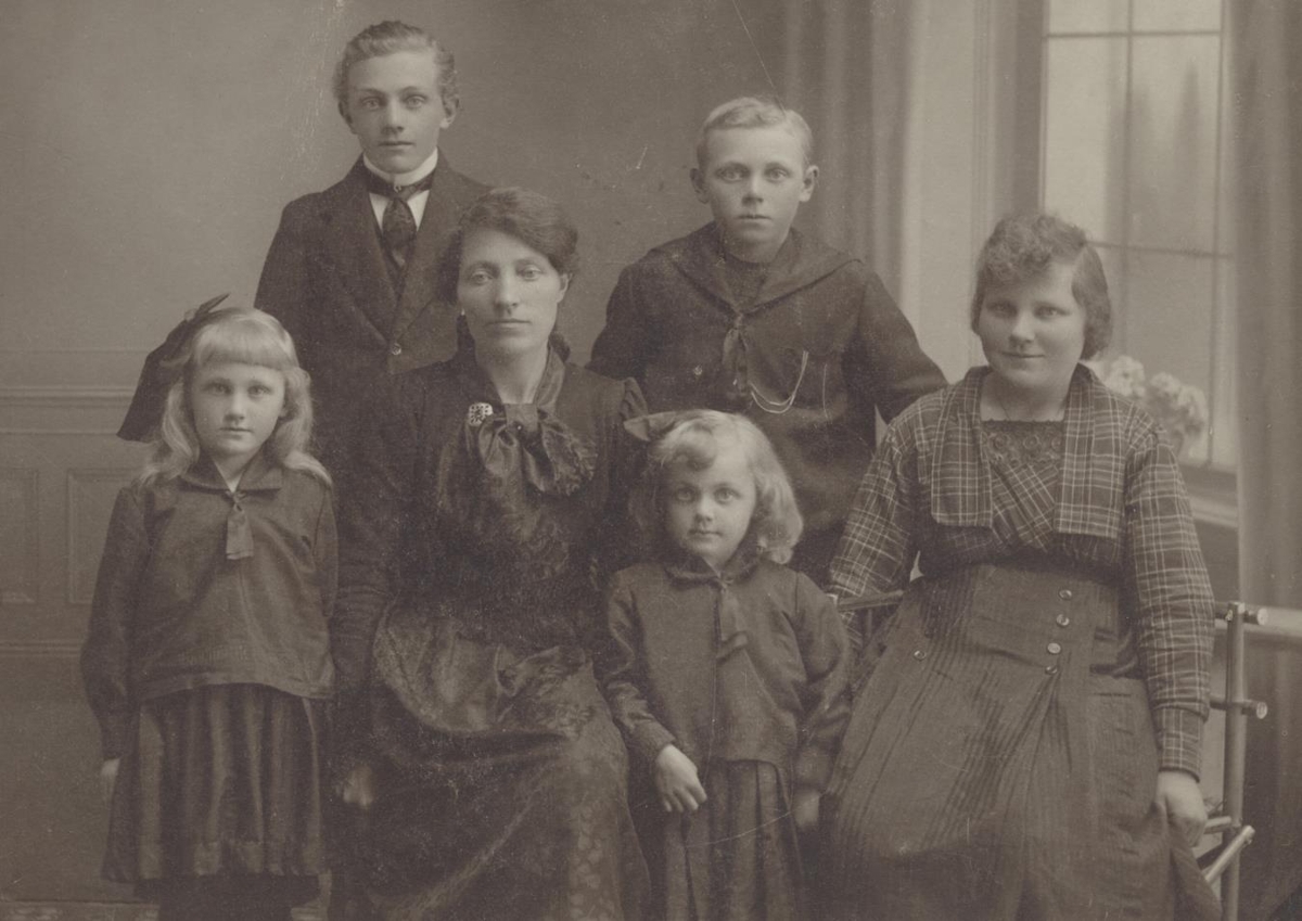 Róshildur Jónsdóttir frá Mosakoti á Síðu ásamt börnum sínum. Róshild er þarna með 5 af 7 börnum sínum. Drengirnir aftast eru frá vinstri: Vilhjálmur Svan og Lárus . Stúlkurnar eru frá vinstri: Sigurlaug, Jóhanna og Guðrún SIGRÍÐUR. Myndin er tekin eftir jarðarför elstu dótturinnar Matthildar. Fimmta dóttirin Guðlaug ólst upp hjá fósturforeldrum á Norðfirði frá fjögurra ára aldri. Myndin er ekki tekin á Byggðavegi 99 á Akureyri en Róshildur fluttist þangað 1948 og bjó þar til æviloka 1968.
