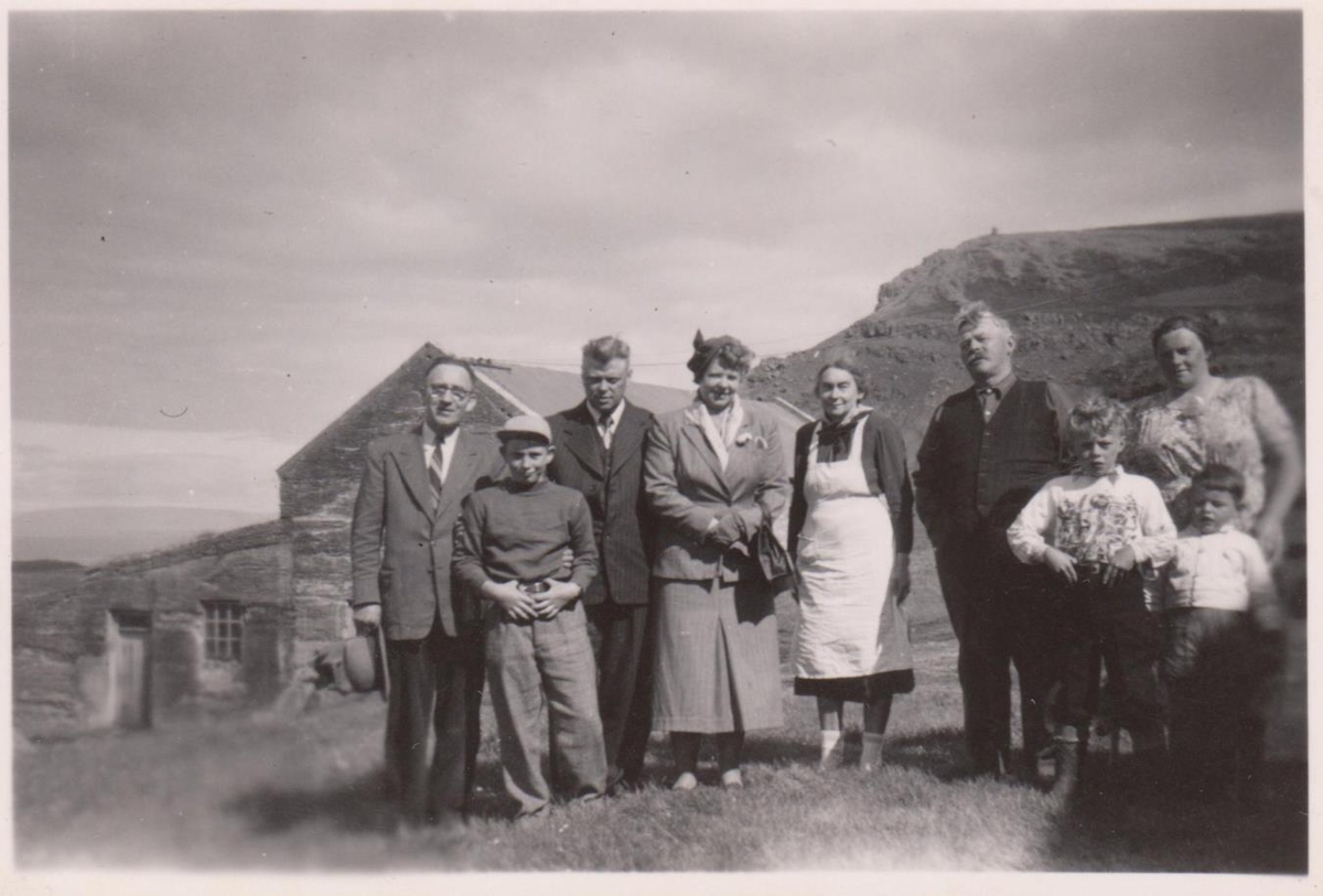 1.-4. frá vinstri óþekktir gestir á Skarði. 5. Elínborg Bogadóttir (1895-1984), 6. Kristinn Indriðason (1887-1971), 7. Kristinn Jónsson (1944), 8. Boga Kristinsdóttir (1915-2003) og 9. Ólafur Eggertsson (1947) fyrir framan Bogu.