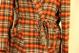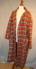 Sloppurinn er rauðköflóttur, síður og með tveimur vösum og beltissnúru. Efnið er 100% ullarefni frá Ullarverksmiðjunni Gefjuni á Akureyri. Stærð: 54.