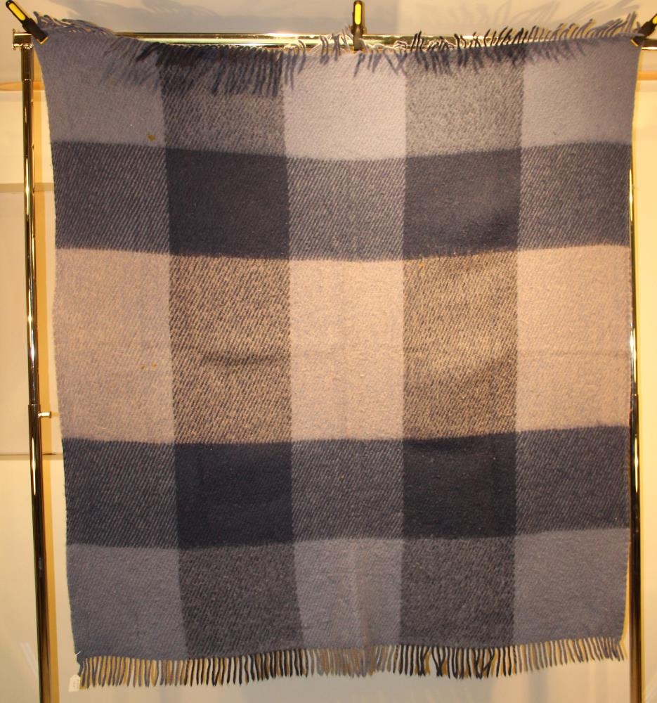 Teppið er bláköflótt með kögri. Þessi voð er ekki einungis úr íslenskri ull. Hún er öðrum þræði ofin hlýhug og þakklæti fyrir vel unnin störf. Á jólum 1987/Guðjón B. Ólafsson.