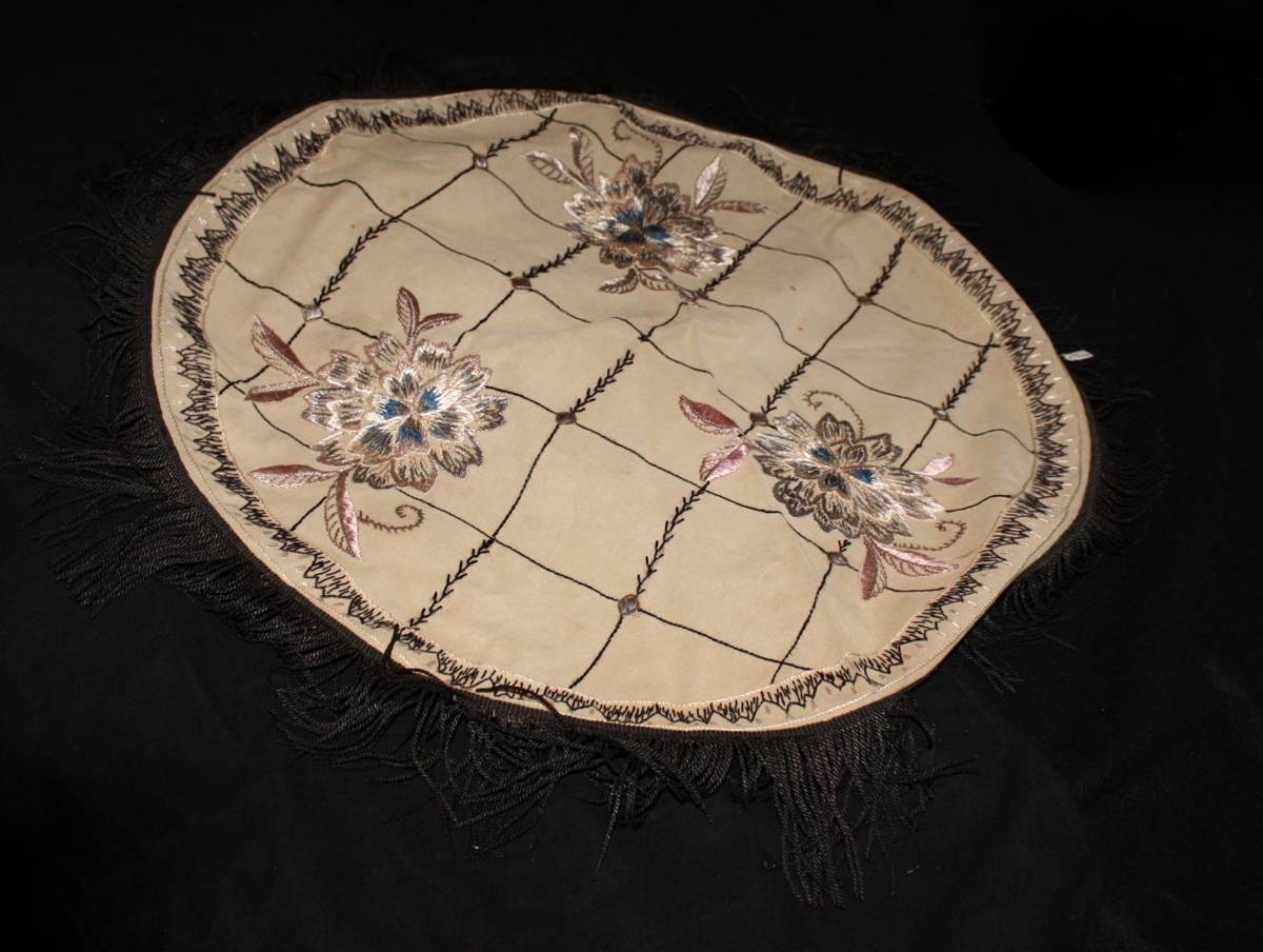 Dúkur hringlaga lítill útsaumaður með dökku kögri, mál 60 sm í þvermál. Úr eigu Ragnheiðar Þorgrímsdóttur Thorgrímssen á Grund (f.1845,d.1933), afh. af Ragnheiði Ólafsdóttur sem er barna,barna,barn hennar.
