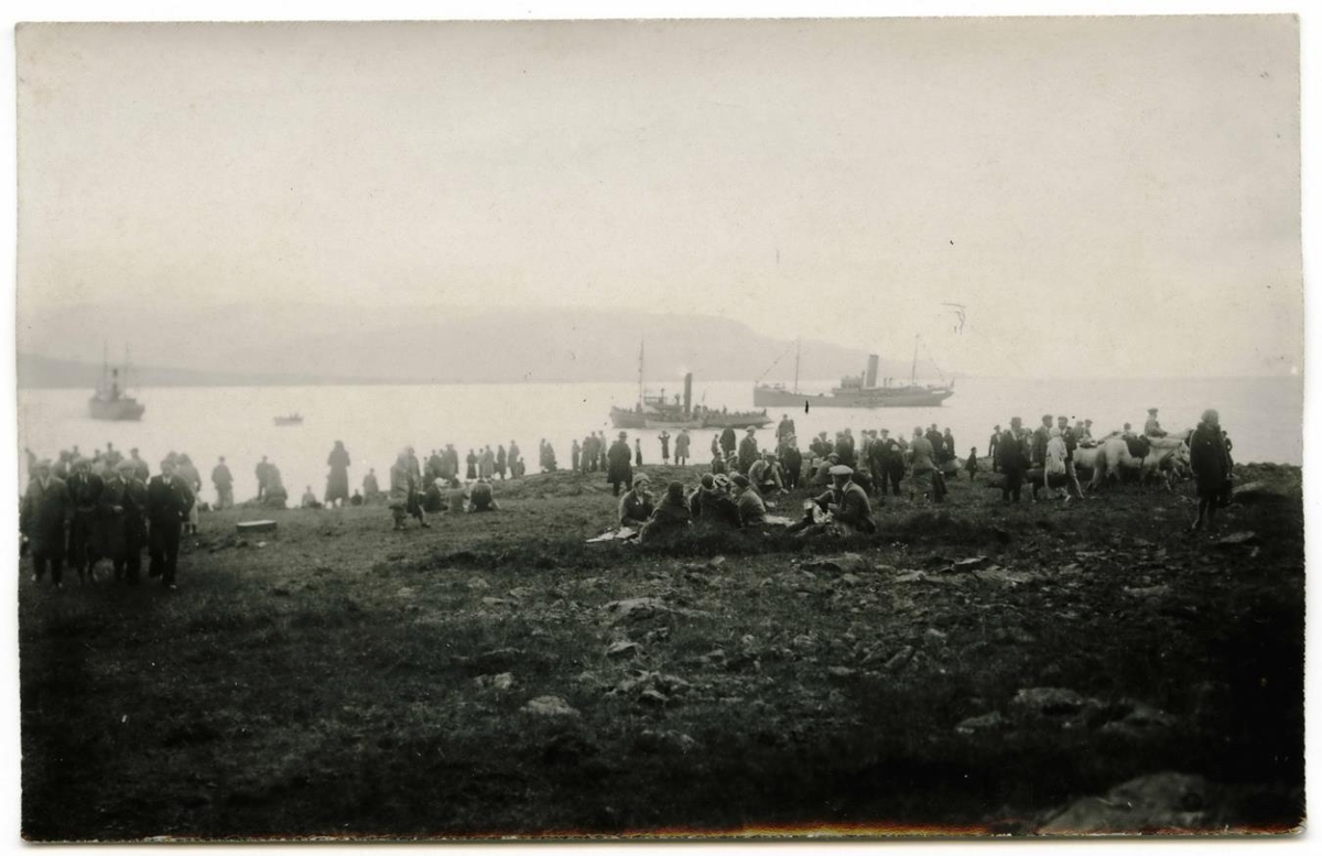 13 ljósmyndir frá Hallgrímshátíð í Saurbæ á Hvalfjarðarströnd 30. júlí 1930. Hátíðargestir komu margir á skipum og voru ferjaðir í land á léttabátum.