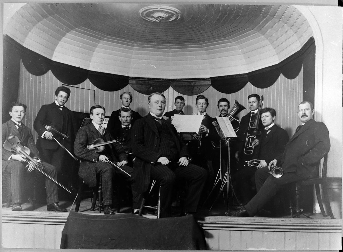 Eftirtaka eftir mynd Magnúsar Ólafssonar af hljómsveit á sviði. Sama mynd og varðveitt er á glerplötu hjá Ljósmyndasafni Reykjavíkur undir númerinu MAÓ 752. Þar stendur "Fiðluleikarar, stjórnandi og menn með blásturshljóðfæri. Hljómsveit Oscars Johansens í Bárunni, sennilega 1912. F.v.: Carl Möller verslunarmaður fiðla, Paul Bernburg verslunarmaður fiðla, Theodór Árnason skrifstofumaður fiðla, Fredriksen kjötkaupmaður fiðla, Jón Ívarsson píanó, Ágúst Markússon veggfóðrari tromma, Torfi Sigmundsson prentari klarinett, Eiríkur Bjarnason járnsmiður bariton, Stefán Gunnarsson kaupmaður tenórbásúna, Jónas Magnússon bókbindari millirödd og Gísli Guðmundsson bókbindari kornet. Oscar Johansen fremstur á mynd."