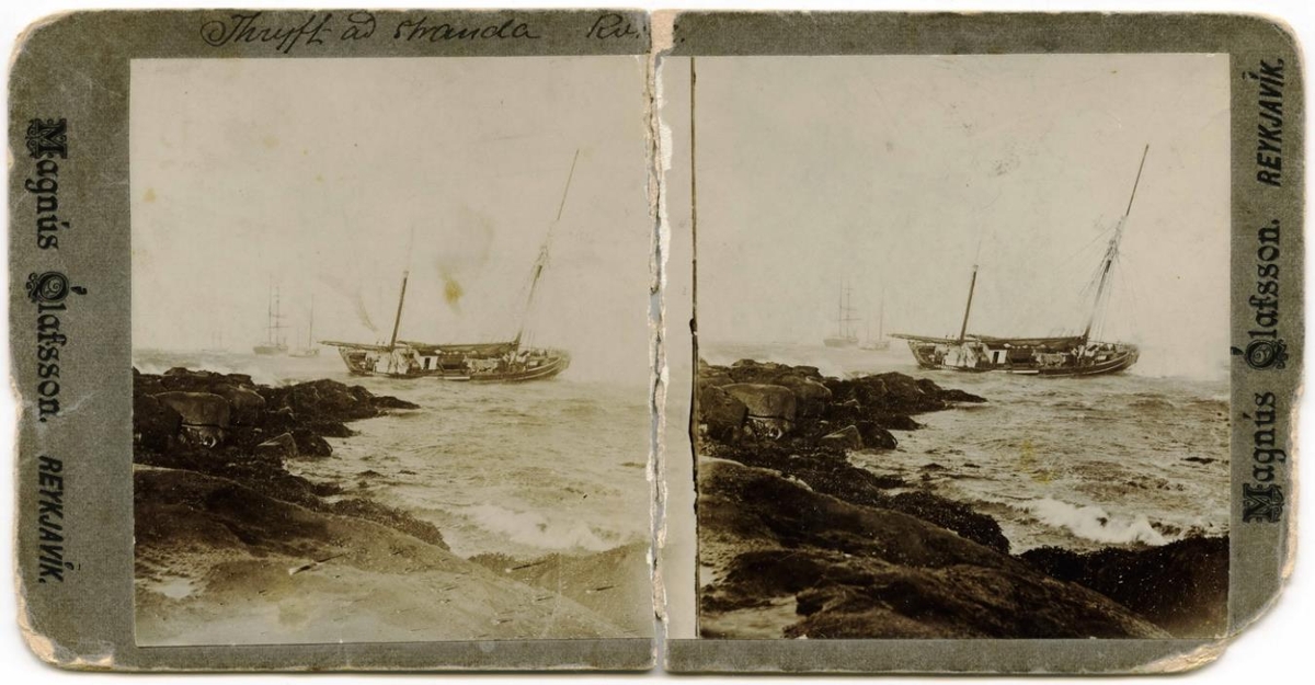 Konungskoman 1907 og fleira. 33 myndir alls. Tvímastra seglskip í þann veginna að stranda rétt utan við klettatanga. Á spássíuna er skrifað: Thryft- að stranda í Rvk.