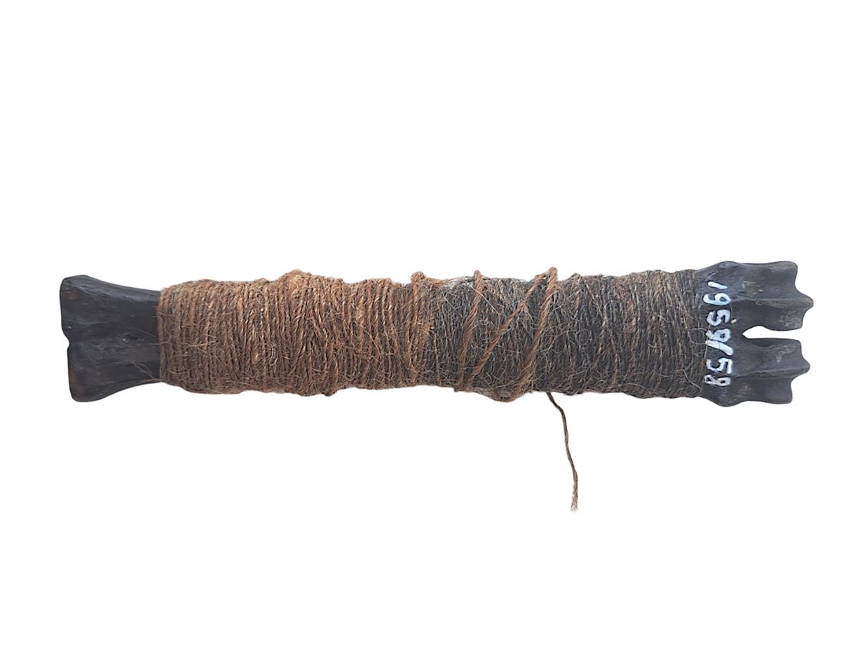 Þráðarleggur,litaður með þræði á. Ólafína Óalfsdóttir ,húsfreyja í Dagsbrún á Akranesi (frá Deild) gaf byggðasafninu 5/11 1958. Henni gaf Guðrún Sigurðardóttir í Nýjabæ á Akranesi,kona Gunnar Árnasonar (í daglegu tali nefndur Nála-Gunnar). Ólafína var þá 17 ára (f.11/10 1902) þráðurinn fylgdi leggnum og hefur verið á honum síðan. Guðrún í Nýjabæ var fædd 1850 á Ölvaldsstöðum í Borgarfirði ,d.2571 1935. Nála-Gunnar dó 4/11 1929.