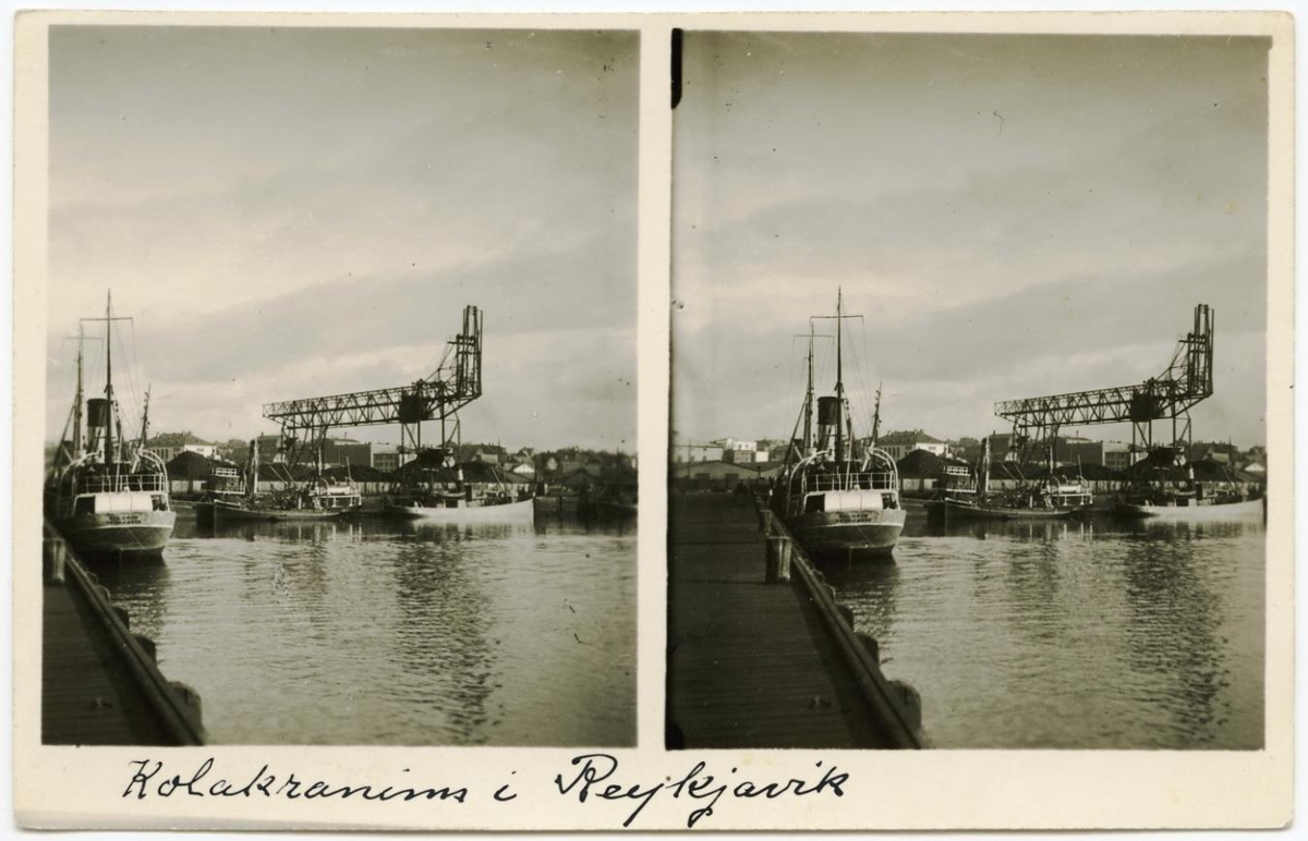 69 myndir, flestar íslenskar. Togari liggur við hafnarbakka t.v., nafnið Belgaum Reykjavík á skutnum. Kolakraninn Hegrinn gnæfir yfir. Á spássíuna er skrifað: Kolakraninn í Reykjavík.