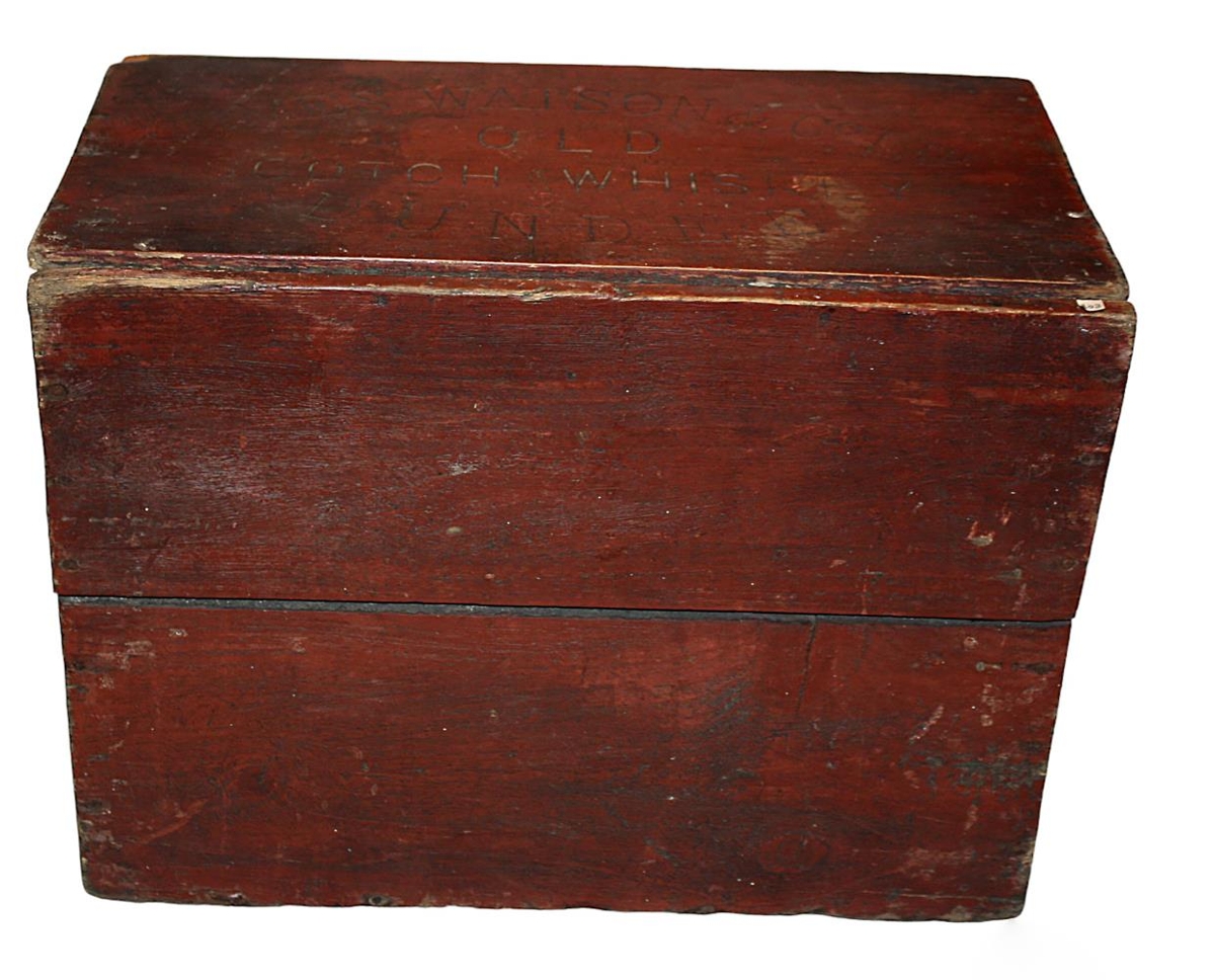 Rauðbrún kista /kassi úr búi Gísla Daníelssonar í Kárabæ á Akranesi. Þetta er kassi sem hefur upphaflega verið undan James Watson & Co Ltd - old Scotch Whiskey - Dundee. Ekki er vitað hvað hann varðveitti í kistunni.