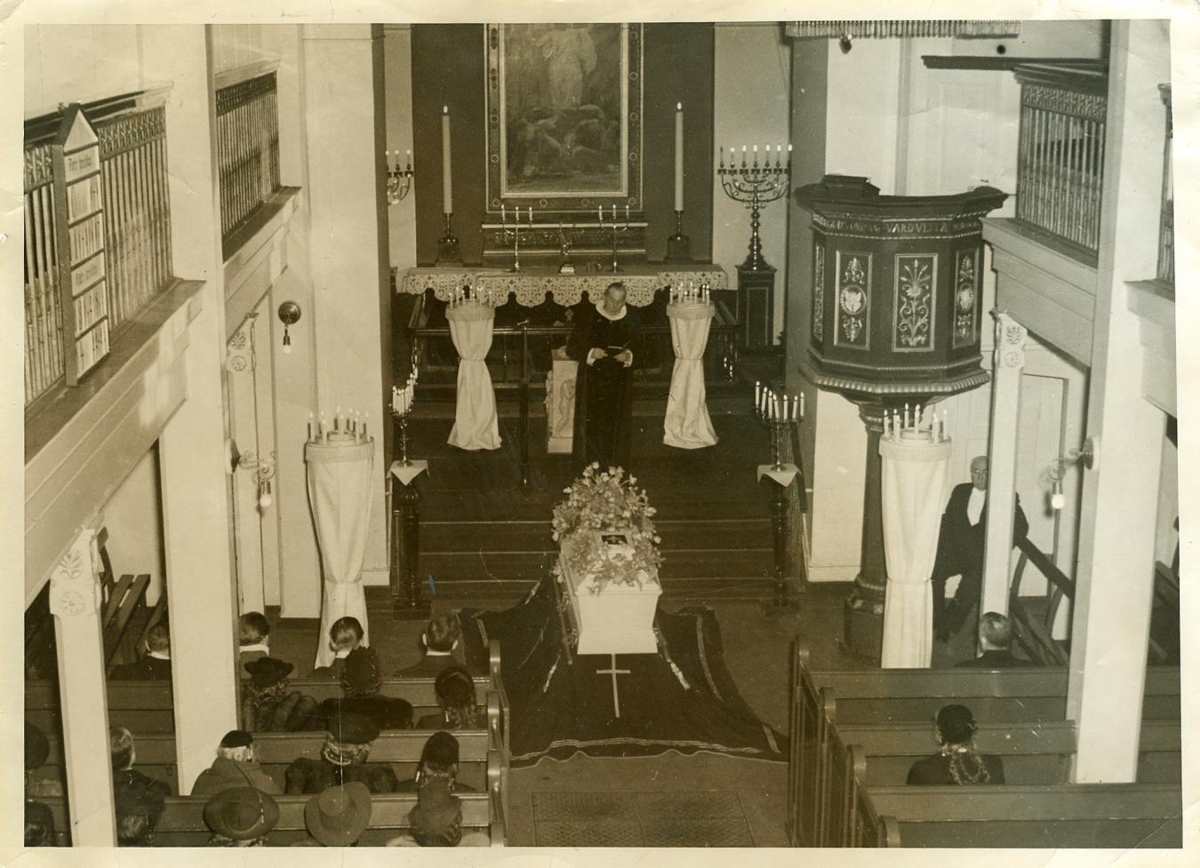 Jarðarför Ármanns Eyjólfssonar úr Dómkirkjunni. Kista, kirkjugestir og presturinn, séra Bjarni Jónsson.