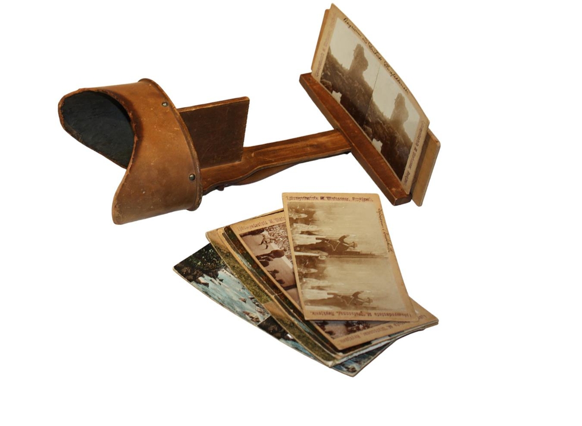 Stereóskópkíkir / steroscope, áhald frá því fyrr á öldinni til að skoða í ljósmyndir í þrívídd.