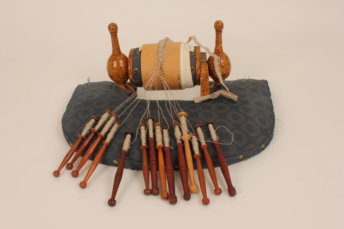 Lítið kniplbretti sem Karólína Guðmundsdóttir vefari átti. Kniplbrettið er klætt ullaráklæði sem Karólína óf.