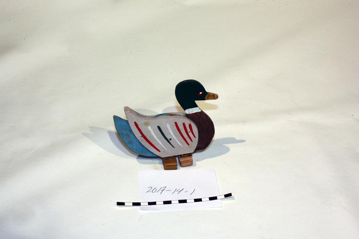 Leikfang, önd, útskorin úr krossvið og handmálað. Litir eru grænn, brúnn, rauður, hvítur og ljósblár. Gefandi telur sig hafa eignast leikfangið í kringum 1950 þegar hún var 4-5 ára gömul. Ekki vitað hver gerði hlutinn.