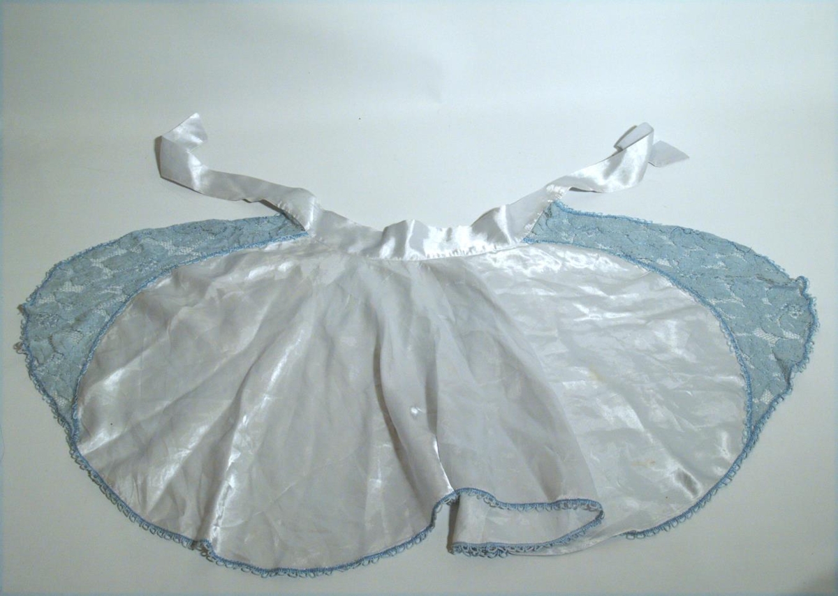 Svunta úr silki, sennilega fyrir börn, litur ljós og ljósblátt hekl.
