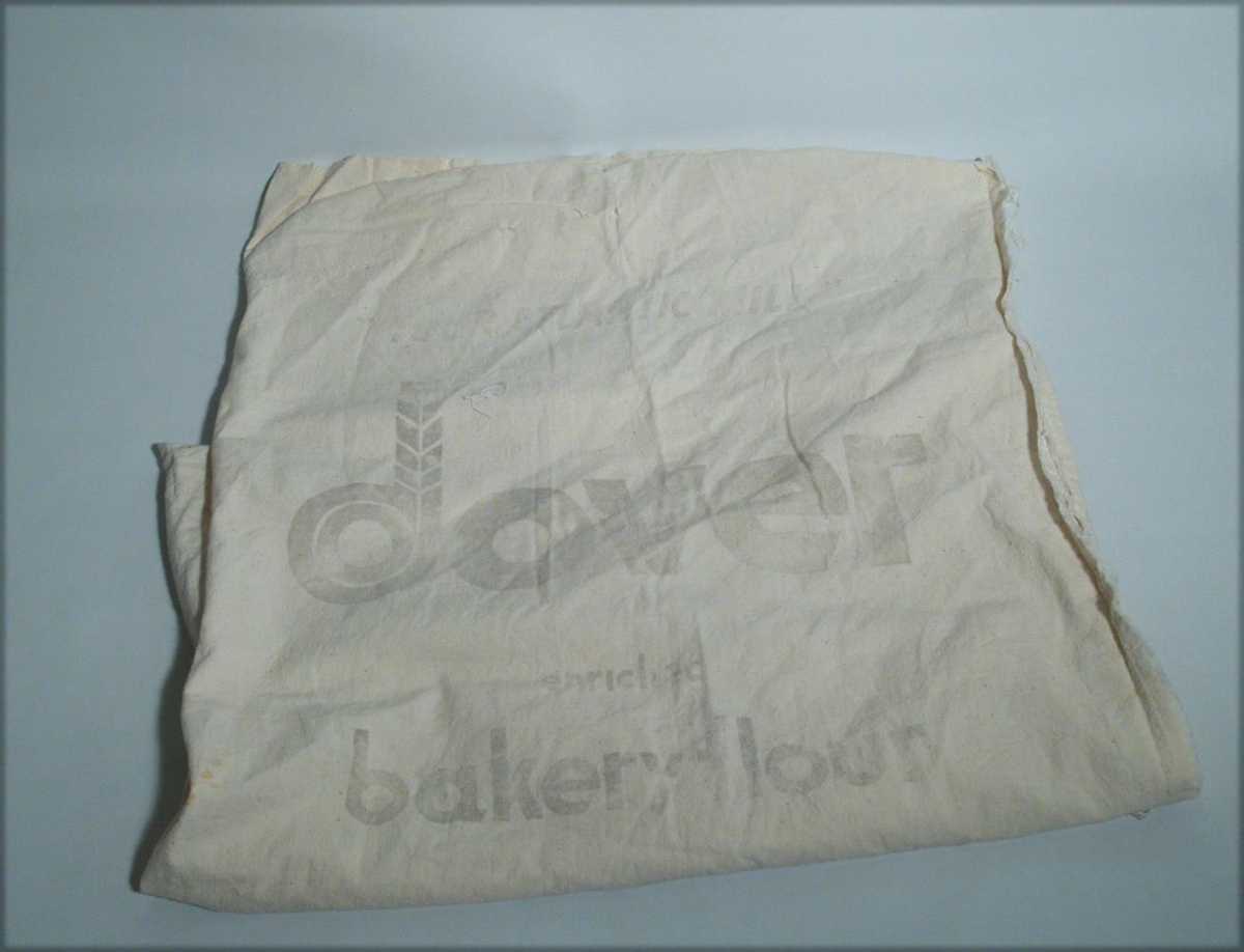 Hvítur hveitpoki sem notaður hefur verið sem koddaver. "Dover" er vörumerkið.