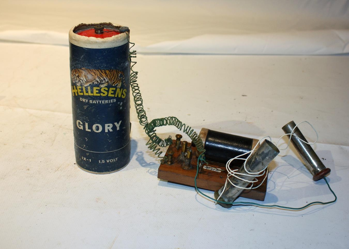 rafall stengdur við 1,5 volta rafhlöðu. Skautin eru framlengd með vírum