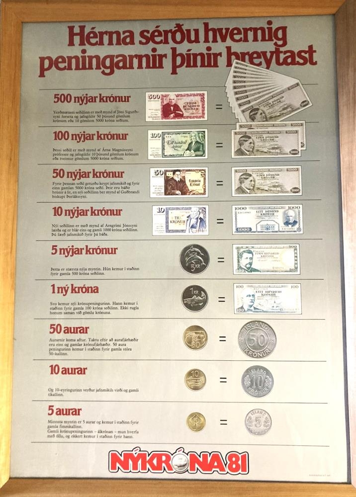 Veggspjald frá Seðlabanka Íslands frá myntbreytingunni 1981. Þar er sýnt hvaða nýju peningar taka við af gömlu.