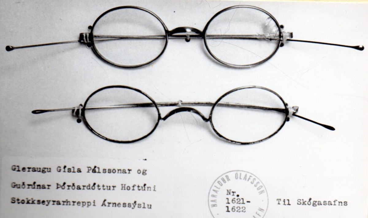 Tvenn spangargleraugu úr eigu hjónanna Gísla Pálssonar og Guðrúnar Þórðardóttur í Hoftúni
