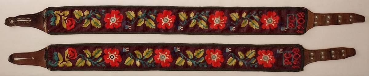Par af útsaumuðum axlaböndum sem Þóra Gísladóttir í Hoftúni saumaði handa bróður sínum Páli. Fangamark hans er saumað í P.G. 1908. Blómamunstur skreytir axlaböndin.