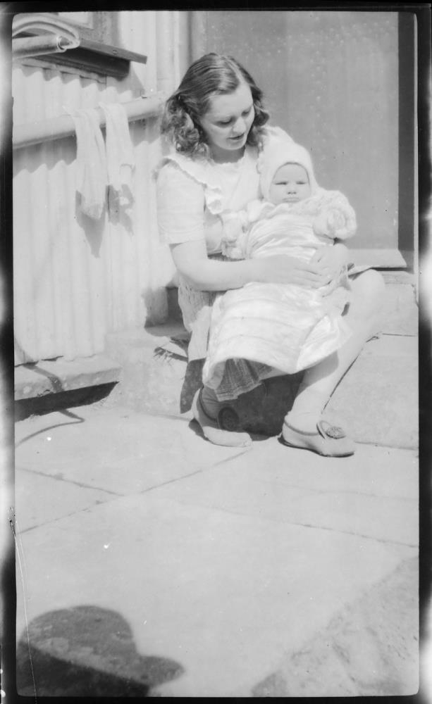 Kona með barn í fanginu situr á tröppum við hús. Þvottaplögg til þerris á rennuniðurfalli. Væntanlega Margrét dóttir Jóhanns með son sinn Einar.