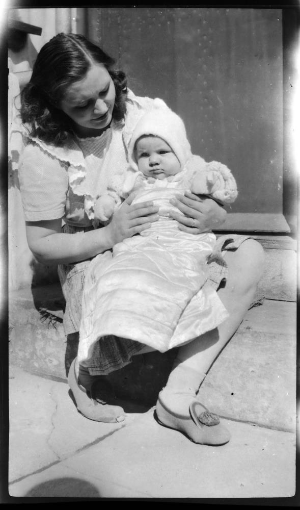 Kona með barn í fanginu situr á tröppum við hús. Líklega Margrét dóttir Jóhanns og sonur hennar Einar.