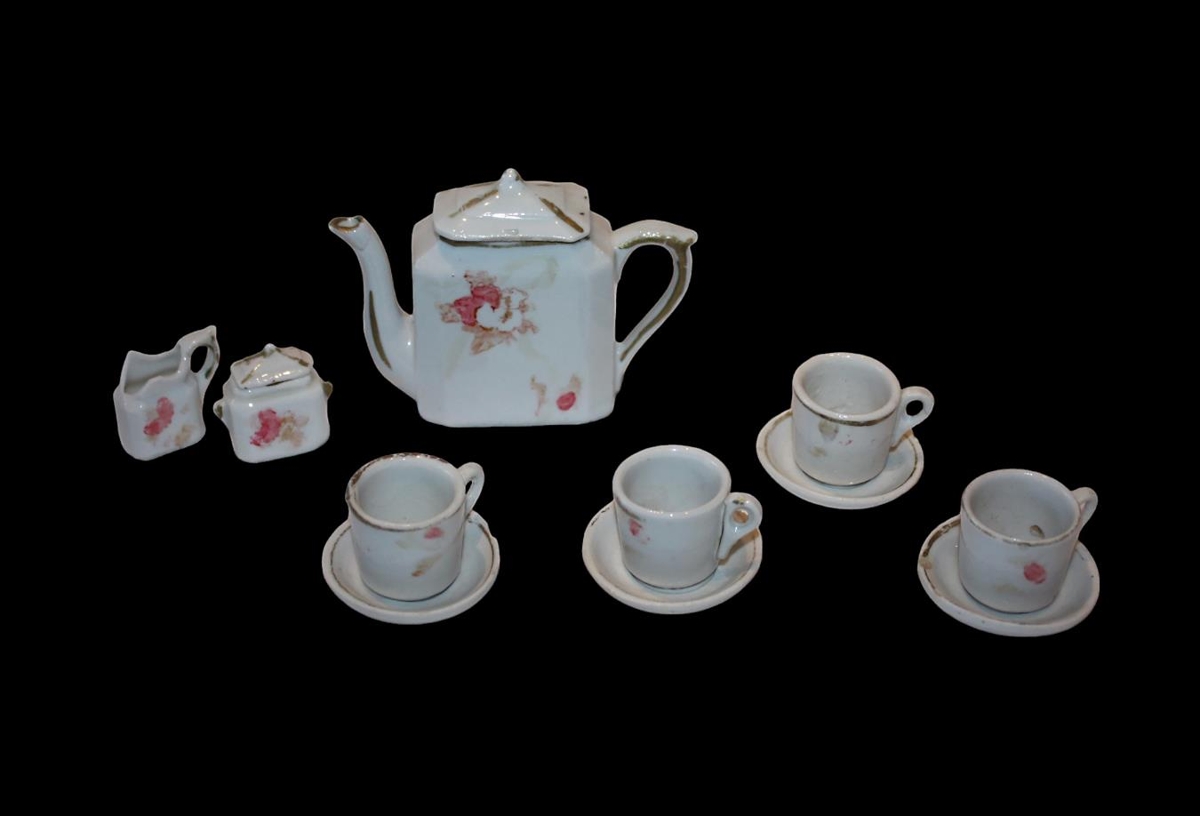 Bollastell (tesett) Leikfanga bollastell úr postulíni,á stellinu hefur verið munstur. Kanna með loki, sykurkar með loki, rjómakanna, fjórir bollar og fjórar undirskálar. Fjórar skeiðar